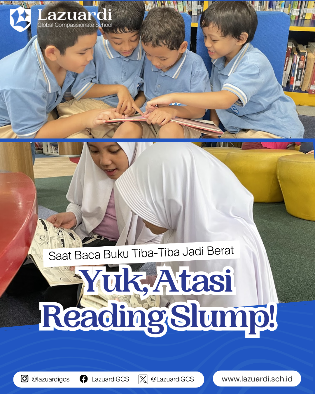 Selain itu, jika Lazuardians mengalami kondisi reading slump ketika di sekolah, Lazuardians bisa datang ke perpustakaan dan temui pustakawan kita. Pustakawan Lazuardi akan dengan senang hati memberikanmu rekomendasi buku yang sesuai, sehingga bisa menaikkan semangatmu membaca.